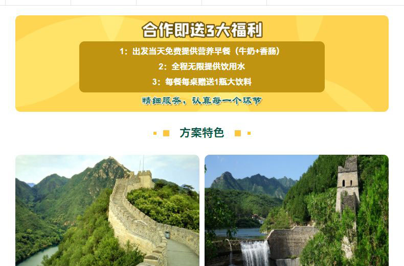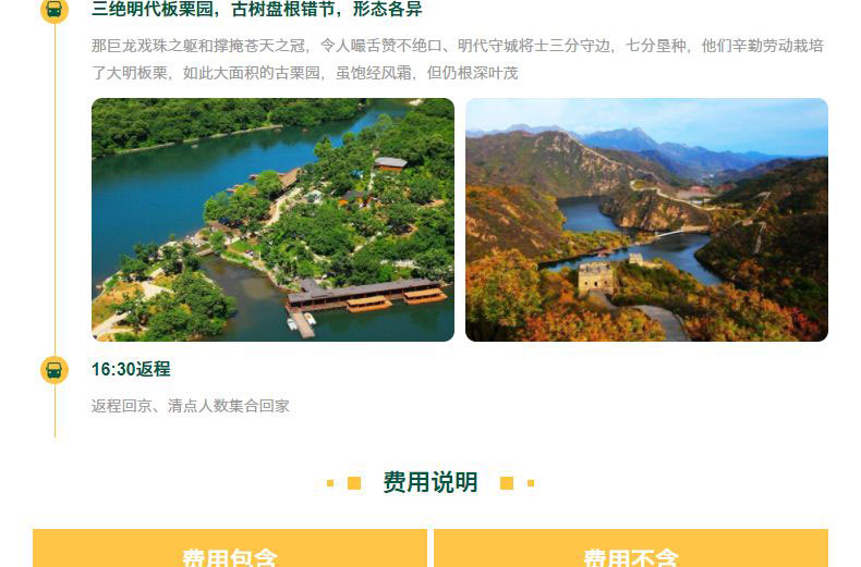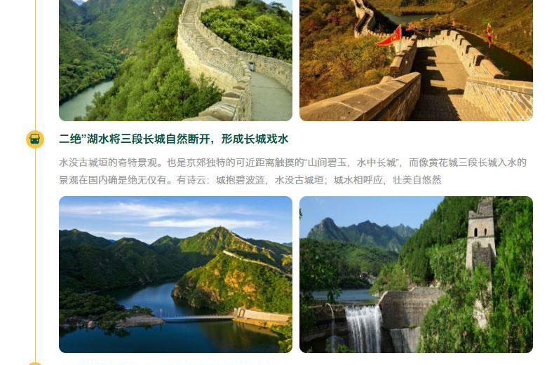 因漫山遍野的黄花而得名黄花城,又因此处三段长城入水而得名水长城。一绝环山绕长城、二绝水断城墙、三绝古树盘绕、气势震撼磅礴